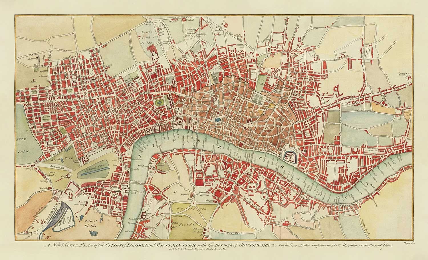 Beaucoup des monuments qui seraient établis au 19ème siècle sont absents - mais beaucoup avaient déjà été érigés en 1784, y compris la cathédrale Saint-Paul, le British Museum, la Tour de Londres, la place Saint-James (et ce qui deviendrait Buckingham Palace juste au bout de la route).