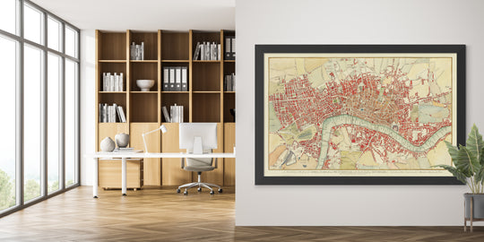 This map is also available as a float framed canvas, sometimes known as a shadow gap framed canvas or canvas floater. The map is printed on artist's cotton canvas and then stretched over a handmade box frame. We then "float" the canvas inside a wooden frame, which is available in a range of colours (black, dark brown, oak, antique gold and white). This is a wonderful way to present a map without glazing in front. See some examples of float framed canvas maps and explore the differences between my different finishes.