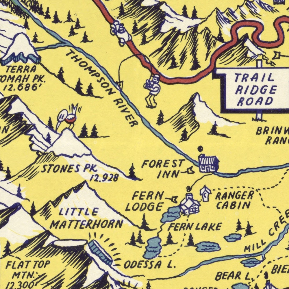 The map traces the park’s great east–west traverse, leading the eye from Estes Park over Trail Ridge Road to Grand Lake—one of America’s classic scenic drives. Lindgren plays up the drama of Millner Pass, where the road leaps the Continental Divide, seasoning the thin air with asides about dizzy heights and sudden weather. An inset of Big Thompson Cañon emphasizes the spectacular gateway from the plains, a winding approach whose sheer walls once seemed to squeeze automobiles like toothpaste. Published in the golden age of motoring vacations, the composition celebrates panoramic pullouts, picnic grounds, and roadside lodges, capturing the spirit of 1940s freedom on four wheels while still mapping the route with disarming, dependable clarity.