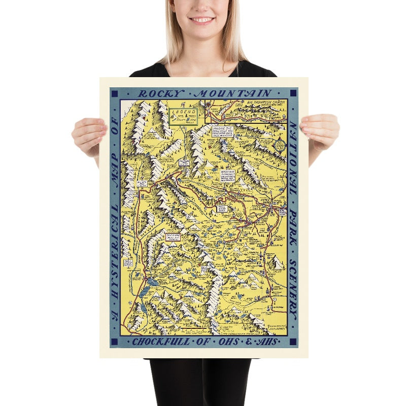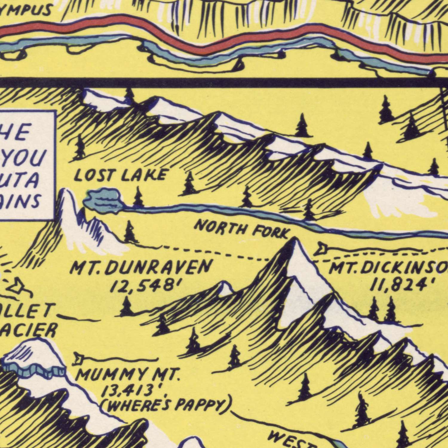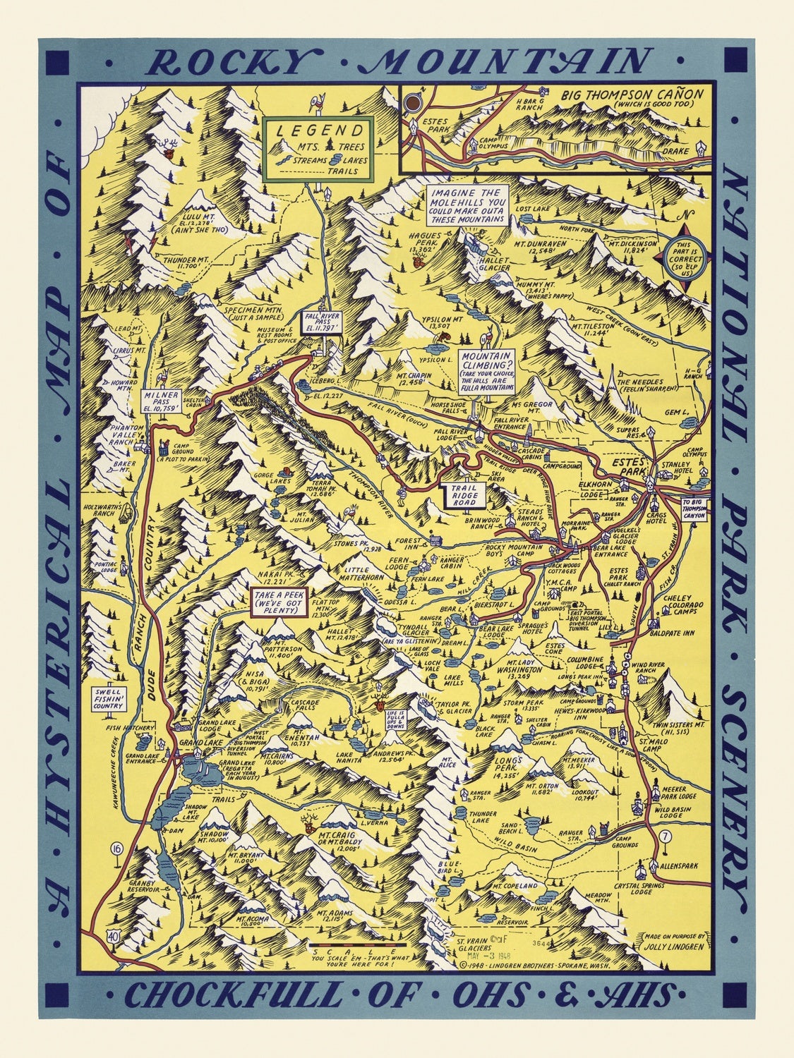True to the Lindgren Brothers’ “Hysterical” series, the sheet teems with playful toponyms and sight gags that make geography memorable: Lulu Mountain and Thunder Mountain grin across the skyline; Specimen Mountain hints at geologic curiosities; Piano Rock strikes a whimsical chord. Campgrounds, lodges, and trails are scattered like breadcrumbs, turning the composition into both souvenir and field guide. The result is more than comic relief—it’s a considered portrait of place, where humor becomes a mnemonic for peaks, passes, and canyons. As a cultural artifact, it distills the optimism of the late 1940s, when national parks promised democratic adventure, and maps—bright, personable, and keen-eyed—helped travelers find both the road and the story.