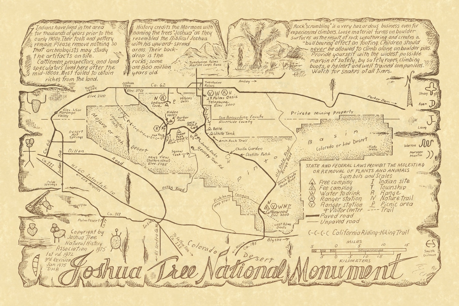 Gilman Smith’s 1975 third edition of Joshua Tree National Monument is a masterclass in the pictorial map tradition, where artistry and orientation meet. Rendered in expressive hand-drawn detail, it frames the monument within Southern California’s high desert, celebrating the iconic silhouettes of Joshua trees while charting boulder fields, mountain ridges, and sweeping valleys. Functional elements are woven seamlessly into the composition: ranger stations, camps, and visitor centers appear alongside the main approaches via California State Routes 62 and 111. Vignettes cue the eye to landmarks and amenities, while careful notations point to precious water sources. At once an invitation and a guide, the map pairs beauty with practical intelligence, capturing the park’s charisma and its unforgiving, magnetic terrain.
