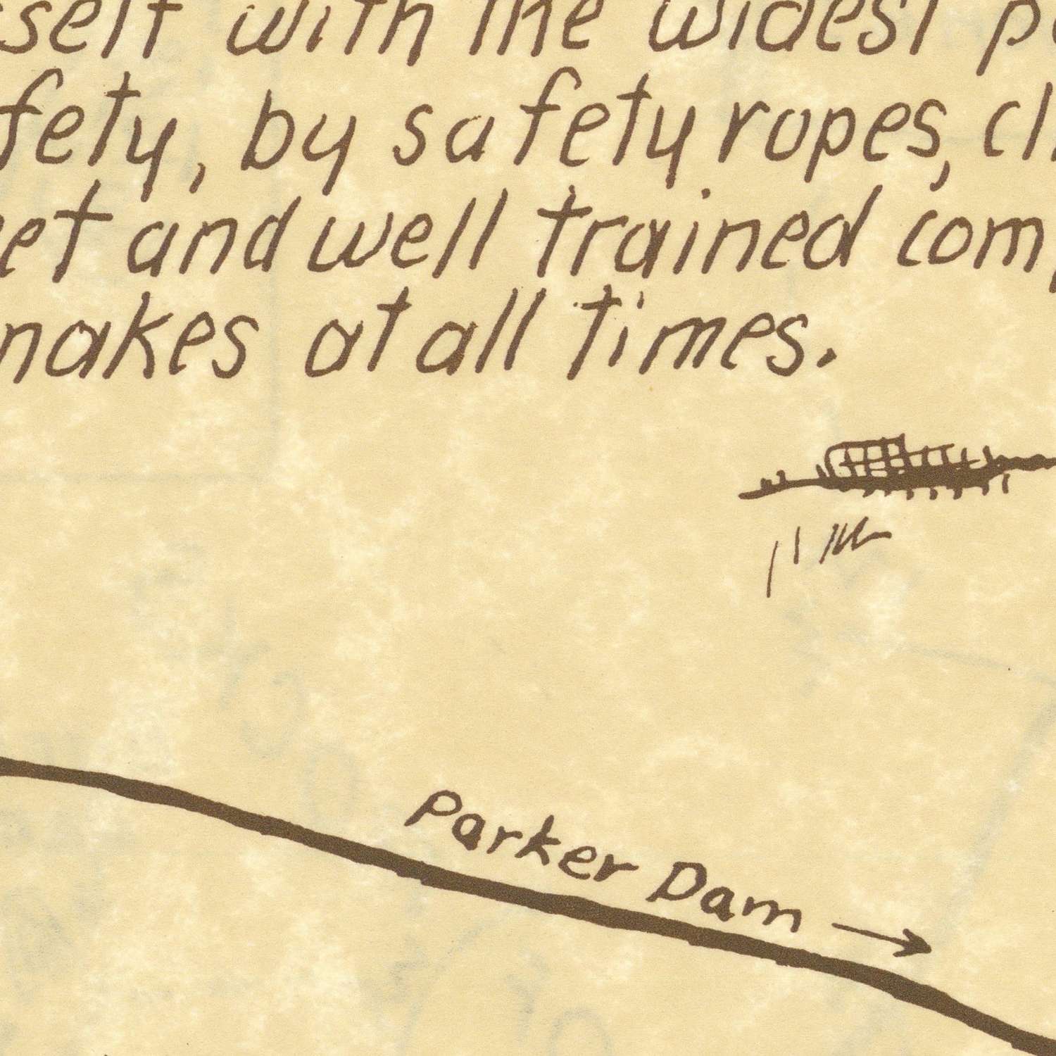 Smith’s annotations on safety and desert survival elevate the work from pretty panorama to lived counsel. Rock-climbing cautions are paired with practical wayfinding, sequencing scrambles and drop-offs amid the monzogranite piles while reminding visitors to respect weather, heat, and exposure. Water points are clearly identified and emphatically scarce, reinforcing the need to plan itineraries from campground to campground and to check in with ranger stations. The map’s voice reflects the era’s growing backcountry ethos: leave no trace, tread lightly on cryptic soils and fragile oases, and allow time, light, and distance to dictate the day. Its guidance is as relevant now as it was to desert wanderers of the 1970s.