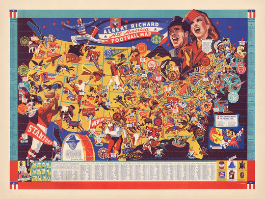 La « Albert Richard All-America Football Map » est un artefact captivant de 1941, conçu par Albert Richard Co., une entreprise réputée pour ses élégants manteaux de sport pour hommes et garçons. Cette carte est une célébration vibrante de la popularité croissante du football américain à la veille de la Seconde Guerre mondiale, en mettant l'accent sur le jeu universitaire. Illustrée par FE Cheeseman, elle présente des représentations dynamiques de joueurs, de mascottes et de bannières universitaires, donnant vie à l'esprit du sport. La carte met non seulement en évidence les surnoms des équipes et les records de la saison 1940, mais détaille également les principaux championnats de conférence, capturant un moment charnière de l'histoire du sport.