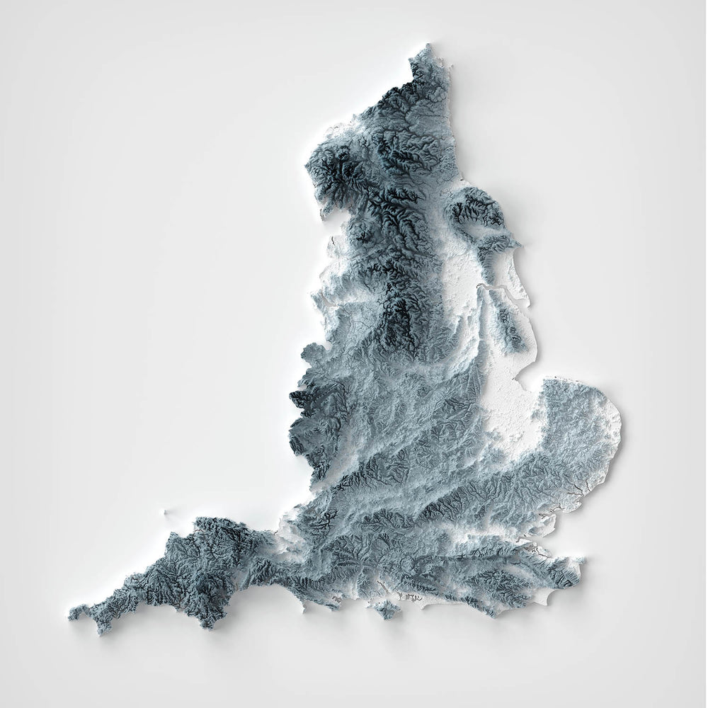 Cette représentation topographique de l'Angleterre est à la fois un hommage à ses formes de terre naturelles et une invitation à explorer - une œuvre d'art où chaque courbe et contour raconte une partie de l'histoire de la nation, et où la lumière et l'ombre s'unissent pour capturer la beauté durable de ce paysage remarquable.