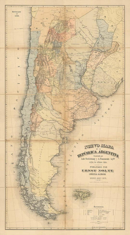 Le "Nuevo Mapa de la República Argentina," élaboré par les mains habiles de A. de Seelstrang et A. Tourmente et publié par Ernst Nolte, est un remarquable exploit cartographique de 1886. Cette carte capture une période transformative de l'histoire argentine, lorsque la nation était en pleine croissance et influencée par l'Europe. Elle délimite élégamment les paysages politiques et physiques de l'Argentine et du Chili sud, offrant un aperçu d'une époque où le pays étendait ses territoires et son infrastructure. La carte est un témoignage des ambitions de l'Argentine et de son identité en évolution en tant que nation d'opportunités.