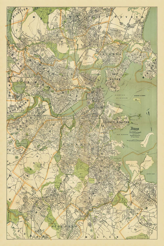 Parmi les caractéristiques les plus captivantes de la carte figurent ses représentations des parcs et espaces publics célèbres de Boston. Le Boston Common et le Public Garden, nichés au centre de la ville, sont clairement marqués, tout comme les étendues verdoyantes de Franklin Park et de l'Arnold Arboretum au sud. Les Back Bay Fens et Jamaica Pond offrent d'autres preuves de l'engagement de la ville envers les espaces verts, reflétant l'influence du système de parc Emerald Necklace de Frederick Law Olmsted. Ces points de repère, aux côtés des rivières sinueuses Charles et Mystic et du célèbre port de Boston, fournissent un contrepoint luxuriant au tissu urbain dense de la ville et soulignent l'importance de la nature dans l'identité civique de Boston.