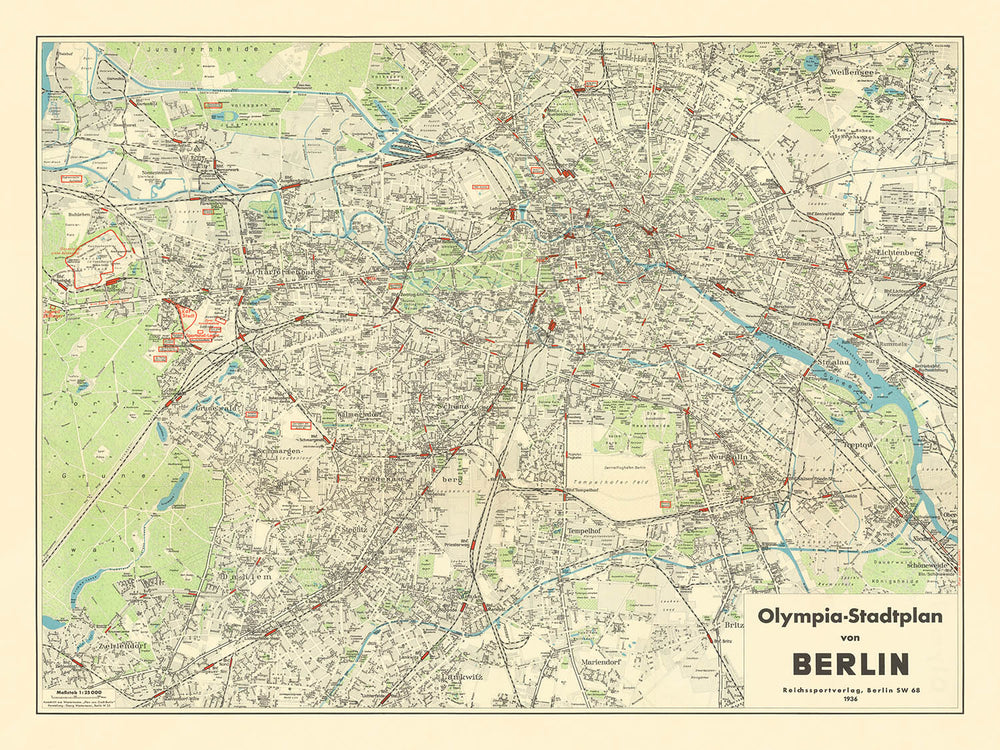 Entrez dans le cœur de Berlin des années 1930 avec le "Olympia-Stadtplan von Berlin," une carte de la ville magistralement détaillée publiée en 1936 par le Reichssportsverlag. Créée expressément pour les Jeux Olympiques d'été de 1936, cette carte offre une fenêtre unique sur une ville à la croisée de l'histoire et du spectacle. Son titre allemand original, riche de promesses olympiques, laisse entrevoir l'objectif de la carte : guider les visiteurs internationaux à travers la métropole vibrante et tentaculaire alors qu'elle accueillait les Jeux de la XIe Olympiade—un événement qui deviendrait l'un des plus scrutés et discutés de l'histoire moderne.