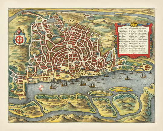 Goa, maintenant un État de l'Inde côtière occidentale, était autrefois un centre commercial central avec une population allant jusqu'à 200 000. Cette carte capture la vie vibrante de la ville avant qu'elle ne soit abandonnée au XVIIIe siècle en raison d'une peste. Des points de repère significatifs tels que l'église de Saint François près de l'eau et le sanctuaire sur les collines à l'est, alors dédié à Saint Bras, sont mis en avant. La carte met également en évidence le palais du vice-roi de Goa le long de la rivière, un témoignage de l'importance politique de la ville pendant la domination portugaise.