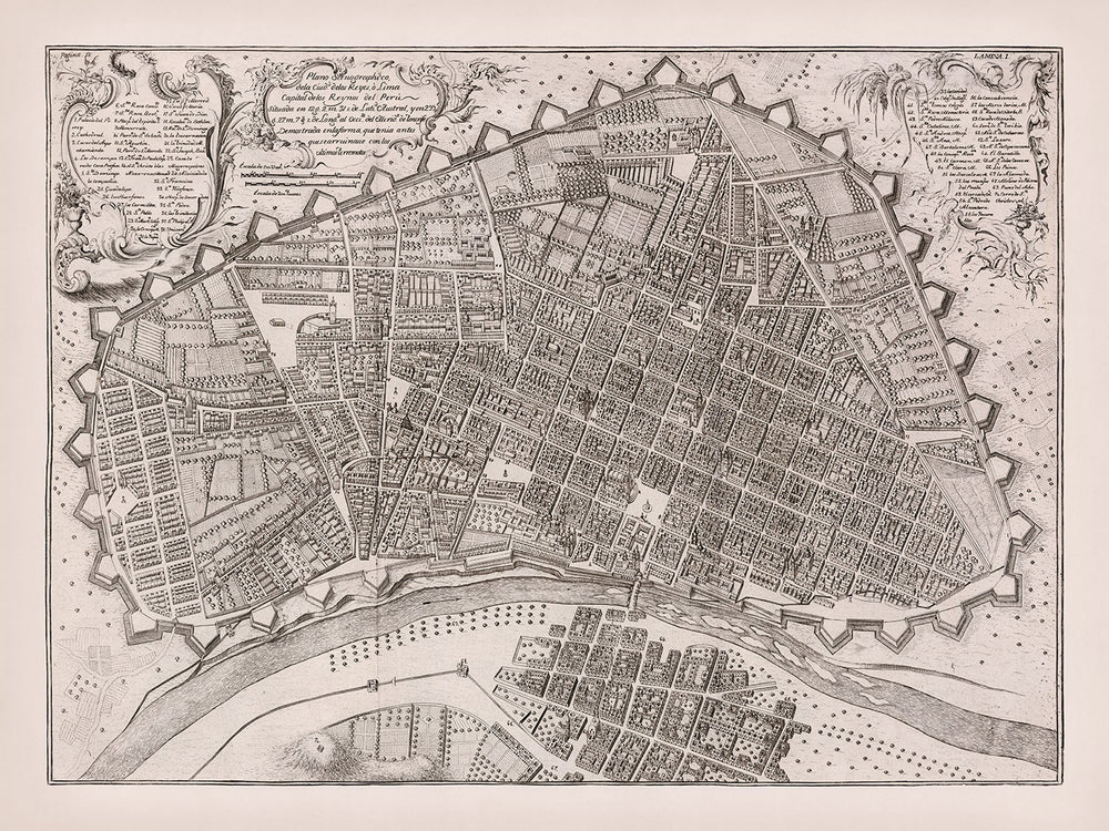 Carte ancienne de Lima par Ulloa, 1748: fortifications, rivière, ponts, pâtés de maisons, cartouches