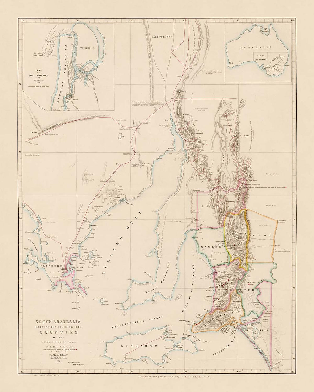 Ancien plan du comté d'Australie du Sud par Arrowsmith, 1858: Adélaïde, Port Adélaïde, Burra, rivière Murray, mines de cuivre