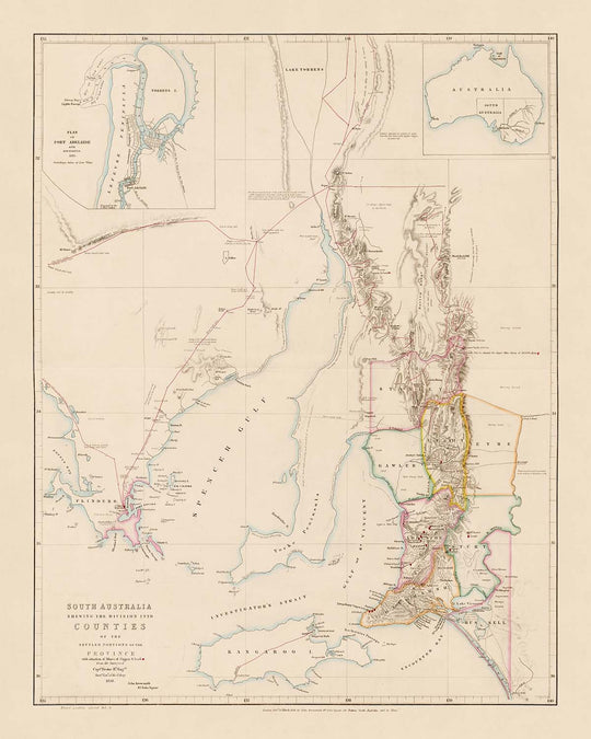 Au-delà de ses dimensions économiques et politiques, la carte est aussi une célébration de l'endroit. Elle nomme et situe les établissements qui deviendraient aujourd'hui des communautés prospères — Adelaide, Port Adelaide, Gawler, et d'autres — tout en capturant l'étendue des caractéristiques naturelles qui ont façonné l'histoire du sud de l'Australie. L'inclusion d'un plan inséré de Port Adelaide, complet avec des sondages de 1846, et d'une carte auxiliaire du continent australien, situe le spectateur dans une narration plus large de découverte et de connexion. Dans chaque détail, cette carte nous invite à retracer le voyage d'une terre et de son peuple, rendu immortel par la main stable de l'un des plus grands cartographes de l'histoire.