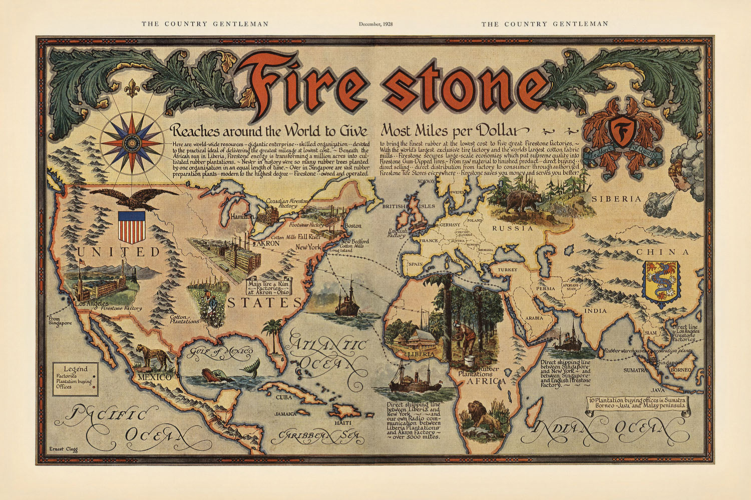 Carte mondiale des vieux pneus Firestone par Clegg, 1928: portée mondiale, scènes industrielles