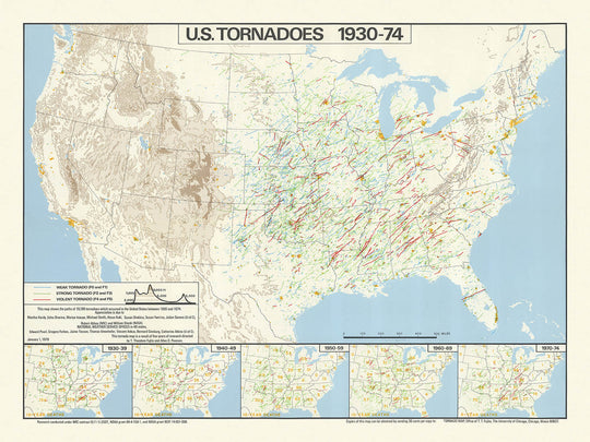 • Cinq cartes insérées, chacune décrivant les décès liés aux tornades par décennie (1930-39, 1940-49, 1950-59, 1960-69, 1970-74)