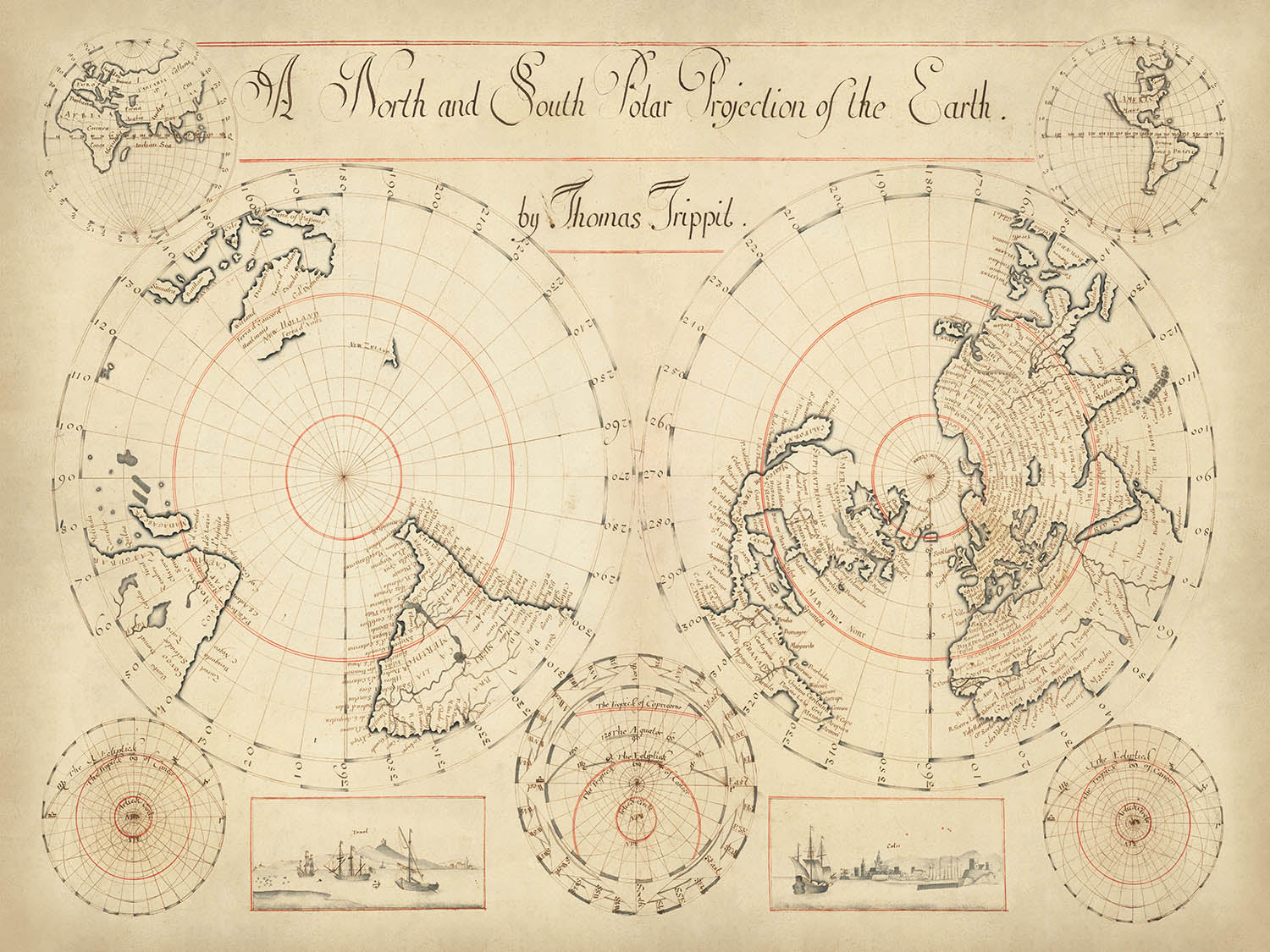 La caractéristique la plus frappante de la carte est son utilisation innovante de projections azimutales équidistantes polaires doubles, centrant le regard du spectateur sur les pôles Nord et Sud. Cette approche était exceptionnellement rare dans la cartographie anglaise du 17ème siècle, distinguant le travail de Trippit de la production plus régionalement centrée de l'École de la Tamise. Le contenu géographique de la carte révèle une fascinante synthèse des connaissances contemporaines et des mythes persistants : la Californie est audacieusement représentée comme une île, "Nouvelle Hollande" (Australie) est délimitée par des découvertes néerlandaises, et le légendaire lac Parime orne l'Amérique du Sud. De telles caractéristiques capturent le mélange d'exploration empirique et de spéculation imaginative de l'époque.