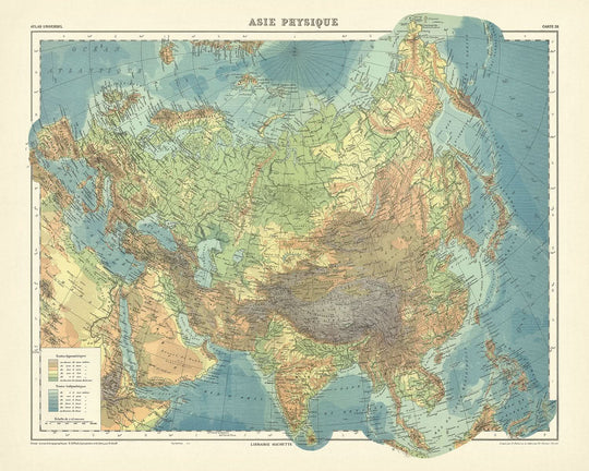 "Asie Physique" est plus qu'une carte : c'est une exploration thématique de la géographie physique de l'Asie. Elle détaille minutieusement les chaînes de montagnes telles que l'Himalaya et l'Oural, ainsi que les principaux plans d'eau comme la mer Caspienne et le lac Baïkal. Ces caractéristiques ne sont pas de simples marqueurs géographiques ; elles sont essentielles à la compréhension des barrières et des conduits naturels qui ont façonné l'histoire humaine et les modes de peuplement à travers le continent. La carte est un outil pédagogique riche, offrant un aperçu du monde naturel tel qu'il était perçu il y a près d'un siècle.