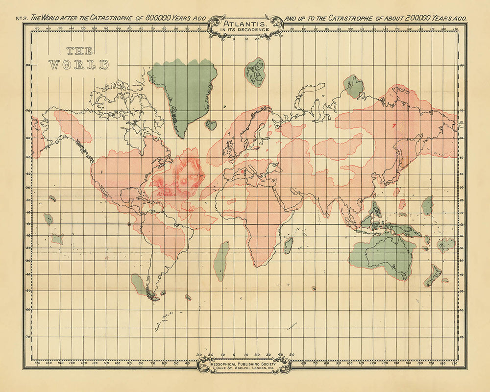 Au cœur de cette carte se trouve la représentation d'Atlantis, un continent censé avoir existé dans l'océan Atlantique. Cette terre légendaire, foyer de civilisations avancées comme les Toltecs, est dépeinte avec une précision spéculative, offrant un aperçu des récits théosophiques de l'évolution humaine. Aux côtés d'Atlantis, la carte présente Lemuria, un continent censé avoir été situé dans l'océan Pacifique. Ces régions sont illustrées avec des zones ombrées, suggérant leur transformation au fil des millénaires et leur rôle dans le développement des races racines anciennes.