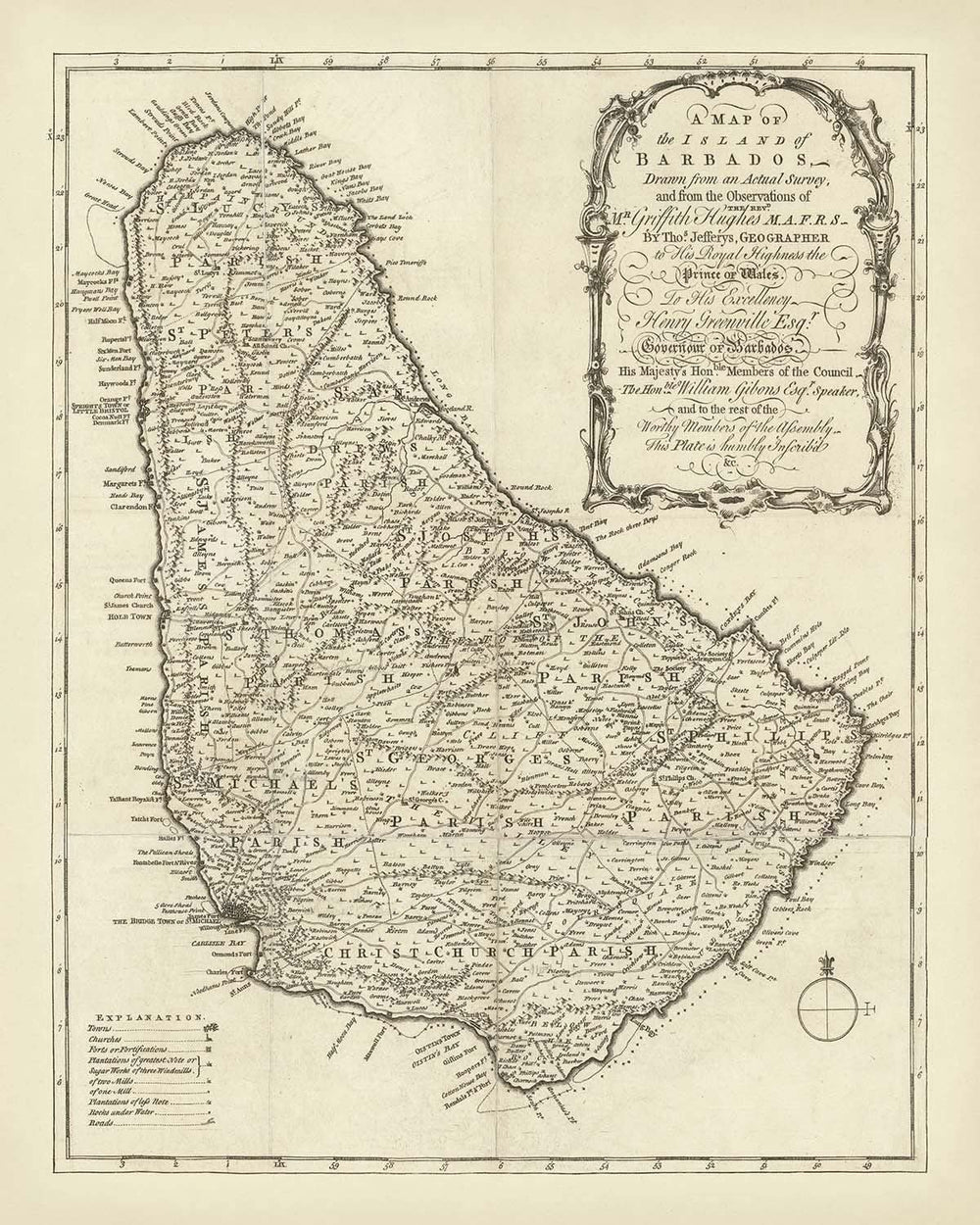 Thomas Jefferys, célèbre cartographe anglais, était célèbre pour ses cartes détaillées des colonies américaines. Sa collaboration avec le révérend Hughes a donné naissance à une carte qui est à la fois un chef-d'œuvre artistique et un document historique. Hughes, alors recteur de la paroisse Sainte-Lucie, a utilisé ses grandes capacités d'observation pour capturer les caractéristiques naturelles de l'île, de ses pentes douces à ses rivières rares mais importantes. Cette carte témoigne de leur expertise combinée et de leur dévouement à l'exactitude.