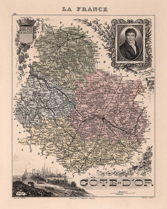 Ancienne carte de la Côte-d'Or par Vuillemin, 1869: Dijon, Beaune, vignobles, rivières, armoiries