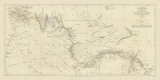 Embarquez pour un voyage à travers l'histoire avec cette superbe carte illustrant la route légendaire du Dr David Livingstone à travers l'Afrique, réalisée par le célèbre cartographe John Arrowsmith en 1857. Cette carte n'est pas seulement une représentation de caractéristiques géographiques ; elle témoigne de l'esprit d'exploration et de découverte du XIXe siècle. Surligné en rouge, le parcours de Livingstone capture de manière vivante son périple monumental de Linyanti à Quelimane, un voyage qui a élargi la compréhension européenne du continent africain. Cette carte se présente comme une fusion remarquable de science et d'aventure, construite à partir d'observations astronomiques méticuleuses et enrichie par les interactions de l'explorateur avec les communautés locales.