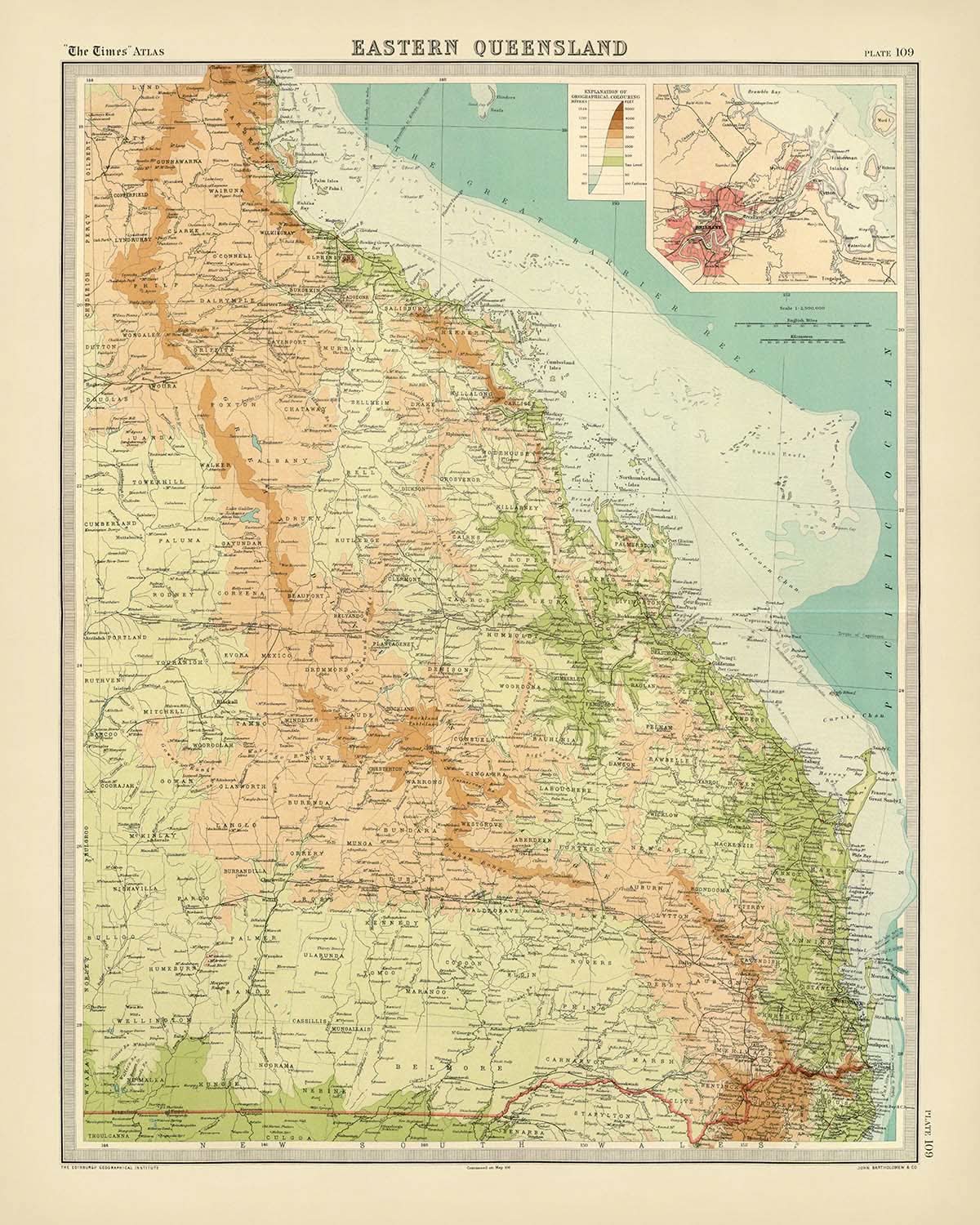 Plongez dans le monde captivant de la cartographie avec la carte « Eastern Queensland », réalisée en 1922 par l'éminent JG Bartholomew. Cette pièce exquise est plus qu'une simple carte ; c'est une fenêtre sur le passé, capturant l'essence de l'est du Queensland avec des détails et un art méticuleux. Bartholomew, une figure célèbre dans le monde de la cartographie, est réputé pour sa précision et son innovation, faisant de cette carte un véritable joyau de collection. Son travail a marqué une évolution significative dans la série Times Atlas, passant des premières cartes d'Andree aux siennes, qui sont célébrées pour leur clarté et leur précision.