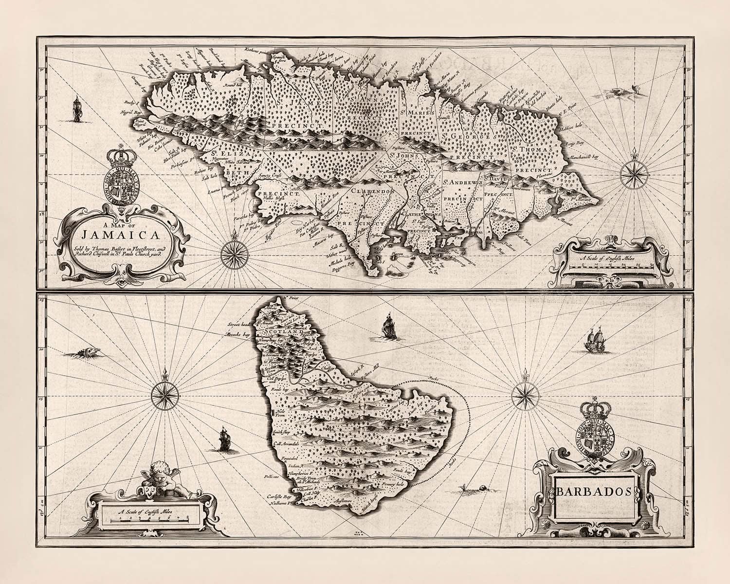 Ancienne carte de la Jamaïque et de la Barbade par Speed, 1676: Port Royal, Bridgetown, montagnes, navires