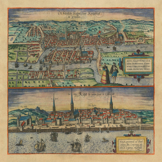 Ancienne carte de Kaliningrad et de Riga par Braun & Hogenberg, 1599: Églises, Tours, Bateaux, Ports, Tenues