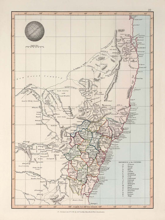 Le design de la carte est un mélange harmonieux de beauté esthétique et de détails informatifs. Les rivières serpentent à travers le paysage, les routes relient des établissements en plein essor, et les hachures représentent habilement le relief varié de la région. L'utilisation de Greenwich comme méridien principal reflète la perspective mondiale de l'époque, tandis que le globe en surimpression fournit un contexte plus large. Chaque élément est méticuleusement conçu, offrant à la fois un délice visuel et une riche source d'informations historiques, en faisant un ajout parfait à toute collection de cartes de qualité.
