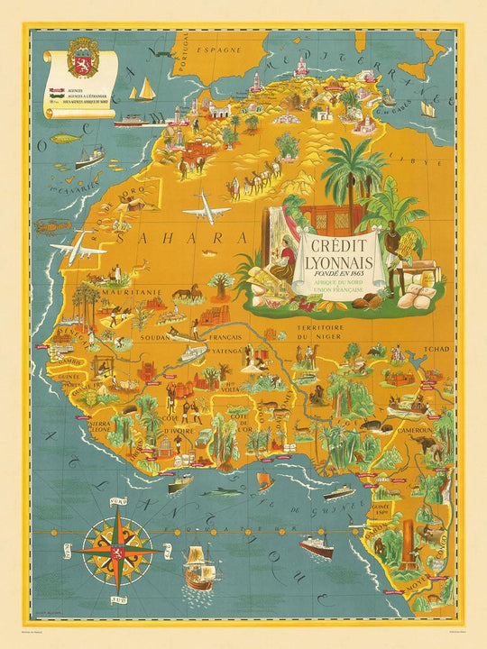Découvrez l'art captivant de Lucien Boucher avec la carte "Crédit Lyonnais Fondé En 1863 Afrique du Nord Union Française", une pièce remarquable de la cartographie du milieu du XXe siècle. Créée vers 1945, cette carte témoigne du style distinctif de Boucher, alliant des couleurs vives et des illustrations détaillées pour représenter les anciennes colonies françaises en Afrique. Alors que la France cherchait à réaffirmer son influence économique après la Seconde Guerre mondiale, cette carte a servi à la fois d'outil promotionnel pour le Crédit Lyonnais et de célébration des riches ressources et industries à travers le continent.