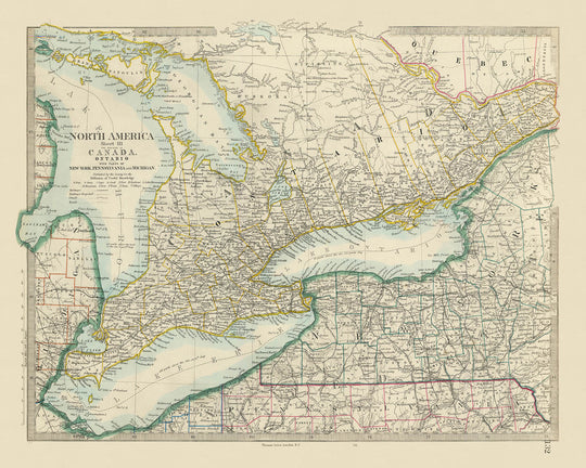 Le focus de la carte sur l'Ontario, la province canadienne la plus peuplée, aux côtés de parties de New-York, de Pennsylvanie et de Michigan, souligne l'interconnexion de ces régions. La représentation détaillée des villes clés et des réseaux de transport témoigne de la croissance rapide et de l'expansion de l'époque. Les chemins de fer, symbole de progrès et de prospérité économique, tissent à travers la carte, reliant des parties éloignées du continent et facilitant le commerce et la colonisation. Ce réseau complexe met non seulement en évidence les avancées technologiques de l'époque, mais aussi l'importance stratégique de ces routes dans la configuration de l'avenir de l'Amérique du Nord.