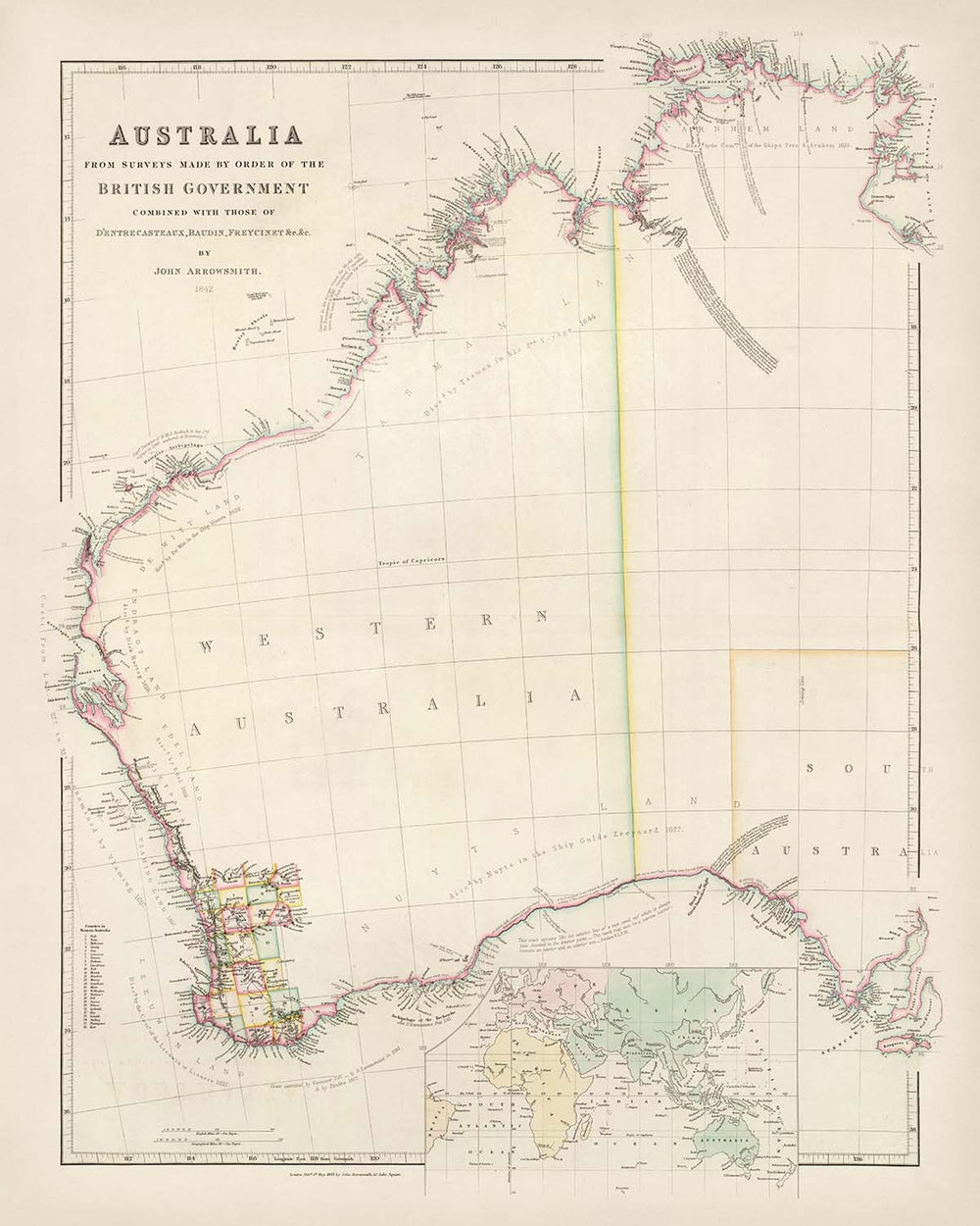 Au-delà de son attrait esthétique, la carte sert de guide géographique pour les régions qu'elle représente. De la ville animée de Perth à la colonie florissante d'Adélaïde, elle met en évidence les principaux centres urbains qui sont depuis devenus de grandes villes. La carte comprend également un encart qui situe l'Australie dans le contexte plus large de la géographie mondiale, soulignant sa position éloignée mais importante dans le monde.