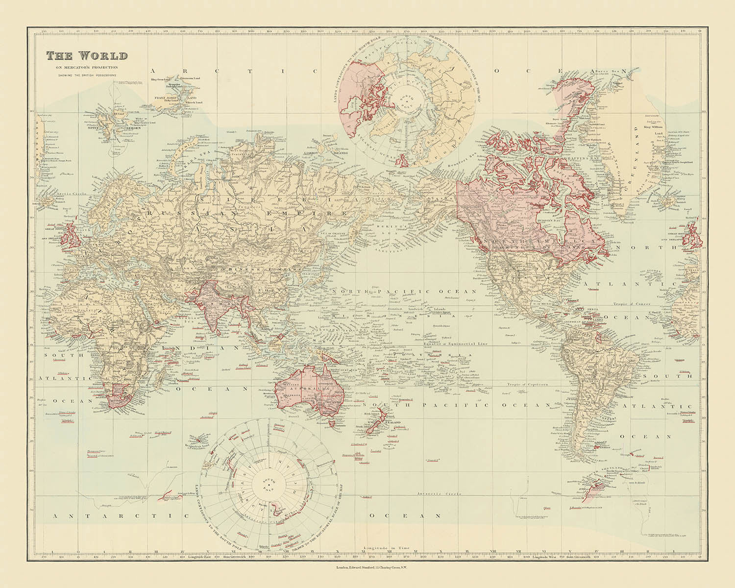 L'expertise d'Edward Stanford en cartographie est évidente dans la conception de la carte, qui utilise la projection de Mercator. Cette projection, bien qu'elle déforme la taille des masses terrestres près des pôles, était privilégiée pour son utilité en navigation. Les détails complexes des frontières politiques et de la géographie physique soulignent l'engagement de Stanford envers l'exactitude et la précision. L'utilisation de couleurs et d'ombres pour mettre en évidence les possessions britanniques souligne encore plus l'ampleur impériale du Royaume-Uni durant cette période.