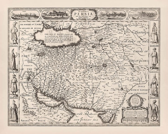 La conception artistique de la carte est encore renforcée par des illustrations de personnages en tenue traditionnelle et des vues panoramiques de villes telles qu'Ormus et Tabriz. Ces embellissements ajoutent une couche de richesse culturelle, fournissant un contexte et une profondeur aux informations géographiques. Les éléments décoratifs de la carte ne sont pas seulement ornementaux ; ils servent à engager le spectateur, l'invitant à explorer les détails complexes et les récits historiques intégrés dans la cartographie. Cette carte de la Perse témoigne du talent artistique et de l'expertise de John Speed, offrant un aperçu intemporel d'une époque révolue.