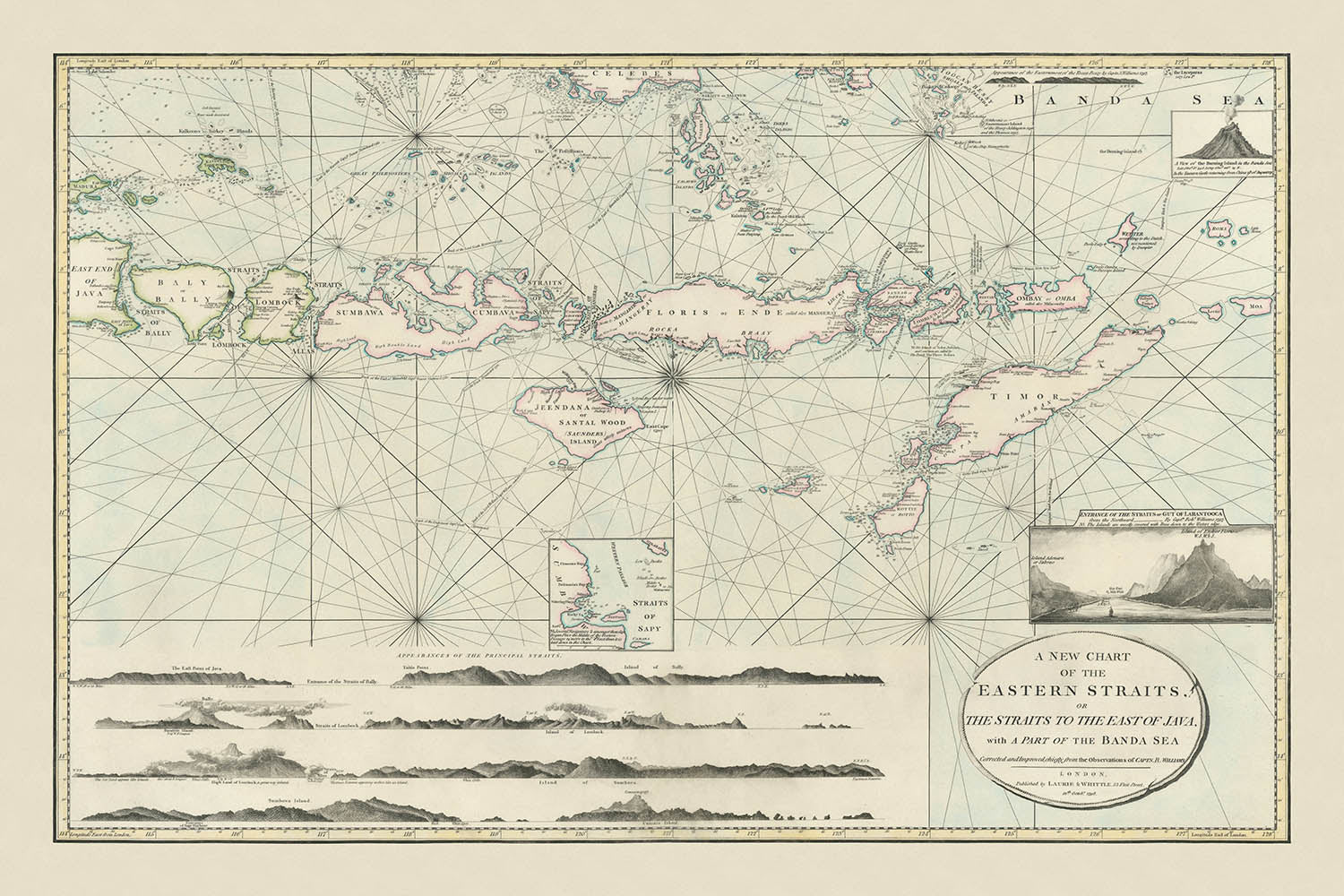 Ancienne carte nautique de Bali, Lombok, Flores, Sumba et Timor par Laurie & Whittle, 1798: Java, mer de Banda, expéditions