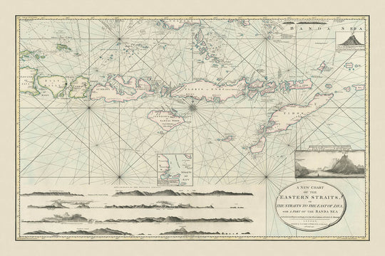 L'attention portée par Laurie & Whittle aux détails est évidente dans la conception de la carte, qui comprend des vues en insert et des profils côtiers qui enrichissent la compréhension du spectateur sur la topographie de la région. La représentation des détroits de Larantooca et d'une île volcanique dans la mer de Banda ajoute des couches d'intrigue, invitant le spectateur à plonger plus profondément dans les caractéristiques géographiques et géologiques de la zone. Ces éléments, combinés aux aides à la navigation de la carte comme les roses des vents et les sondages, en font une ressource inestimable pour comprendre les techniques de navigation historiques.