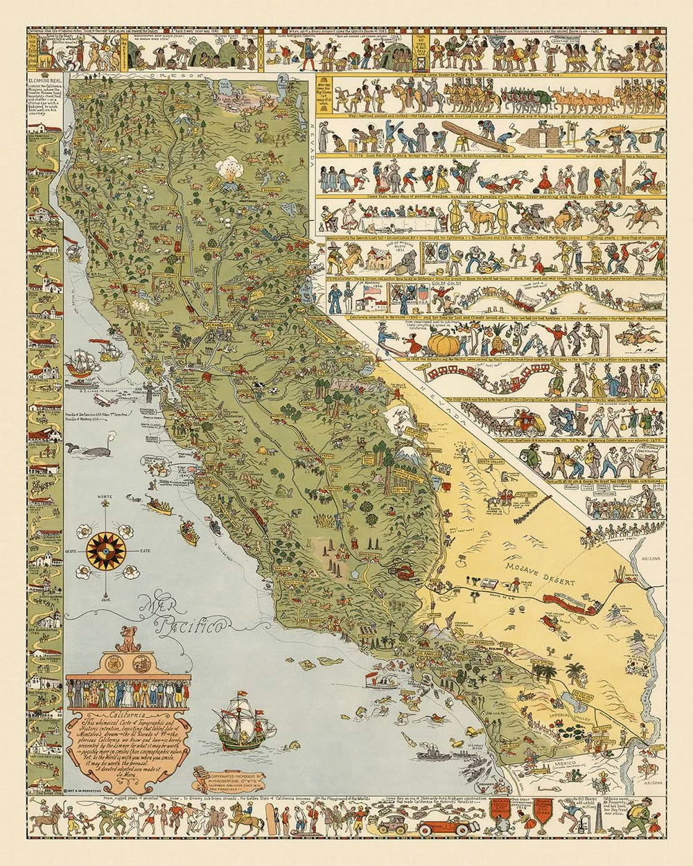 Outre ses sites naturels, la carte regorge de références culturelles et historiques. Des scènes de la vie des Amérindiens, des galions espagnols et des baleiniers peuplent les zones côtières, tandis que l'intérieur regorge de représentations d'activités agricoles et de faune sauvage. L'attention portée par Mora aux détails s'étend à la représentation de caractéristiques géologiques importantes, telles que la faille de San Andreas, qui souligne la nature dynamique du terrain californien.
