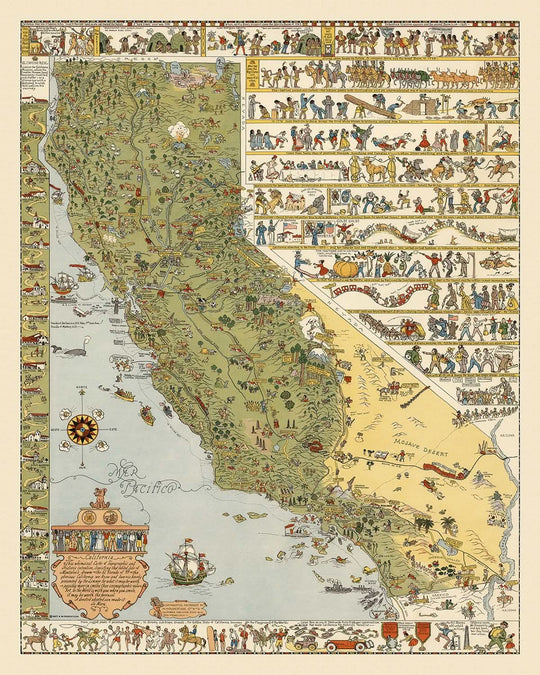 Jo Mora, un artiste célèbre connu pour ses illustrations dynamiques, a conçu cette carte avec un mélange unique de narration thématique et de précision géographique. Son travail témoigne de la mosaïque culturelle vibrante de la Californie, mettant en valeur non seulement sa beauté naturelle, mais aussi les événements historiques qui ont façonné son identité. La carte est un régal visuel, avec des illustrations détaillées qui capturent l'essence de l'esprit et de la diversité de la Californie, ce qui en fait une pièce précieuse pour les collectionneurs et les passionnés d'histoire.