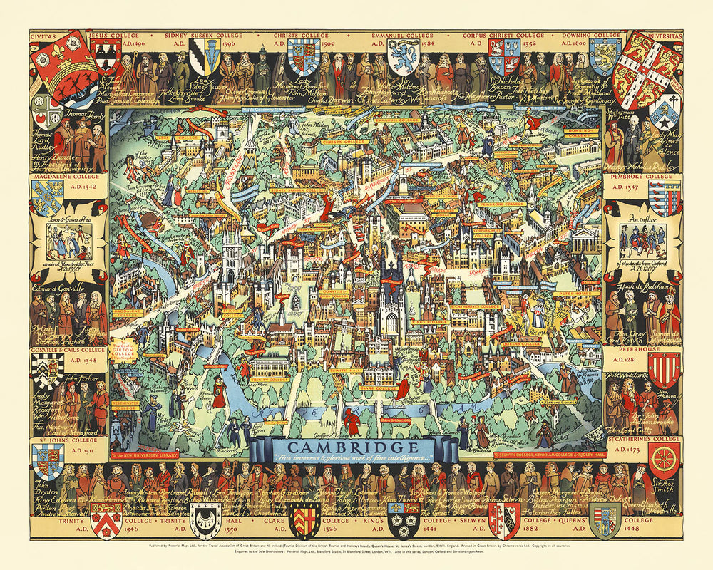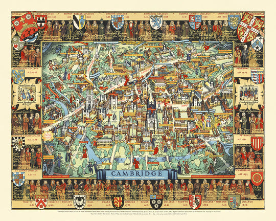 - Une bannière centrale portant le mot "Cambridge", célébrant l'importance de la ville.