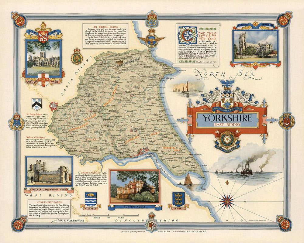 La conception de la carte est un mélange harmonieux de précision géographique et d'embellissement artistique. Elle comporte une superbe rose des vents, des armoiries décoratives et des illustrations de monuments remarquables tels que Walmgate Bar et Burton Agnes Hall. Ces éléments sont judicieusement entrecoupés de notes historiques et de citations de Sir Winston Churchill, ajoutant des couches de contexte et d'intrigue. L'inclusion de produits agricoles locaux met encore plus en évidence les activités économiques qui ont défini la région au cours de cette période.
