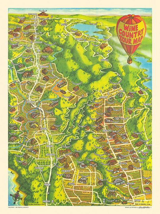 - Carte décorative de la vallée de Napa et de Sonoma, illustrant 94 caves.
