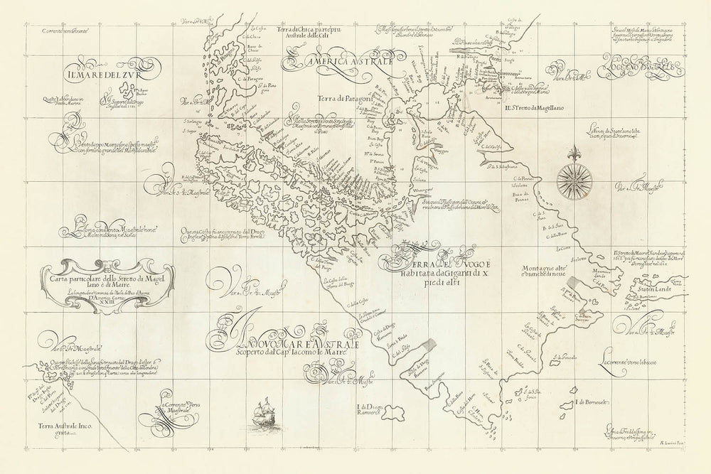 Ajoutant à l'intrigue, la carte préserve les mythes et légendes qui ont coloré les premières explorations. Une note faisant référence aux supposés géants de Patagonie, une histoire née du premier tour du monde de Magellan, suggère le mélange de fait et de folklore qui a accompagné ces voyages périlleux. En bas à gauche, Dudley inclut le continent austral insaisissable, ou Terra Australis, basé sur les récits de Sir Francis Drake—que Dudley connaissait personnellement. Cette masse terrestre spéculative souligne le sens de l'émerveillement de l'époque et la croyance persistante en des mondes non découverts au-delà des mers connues.