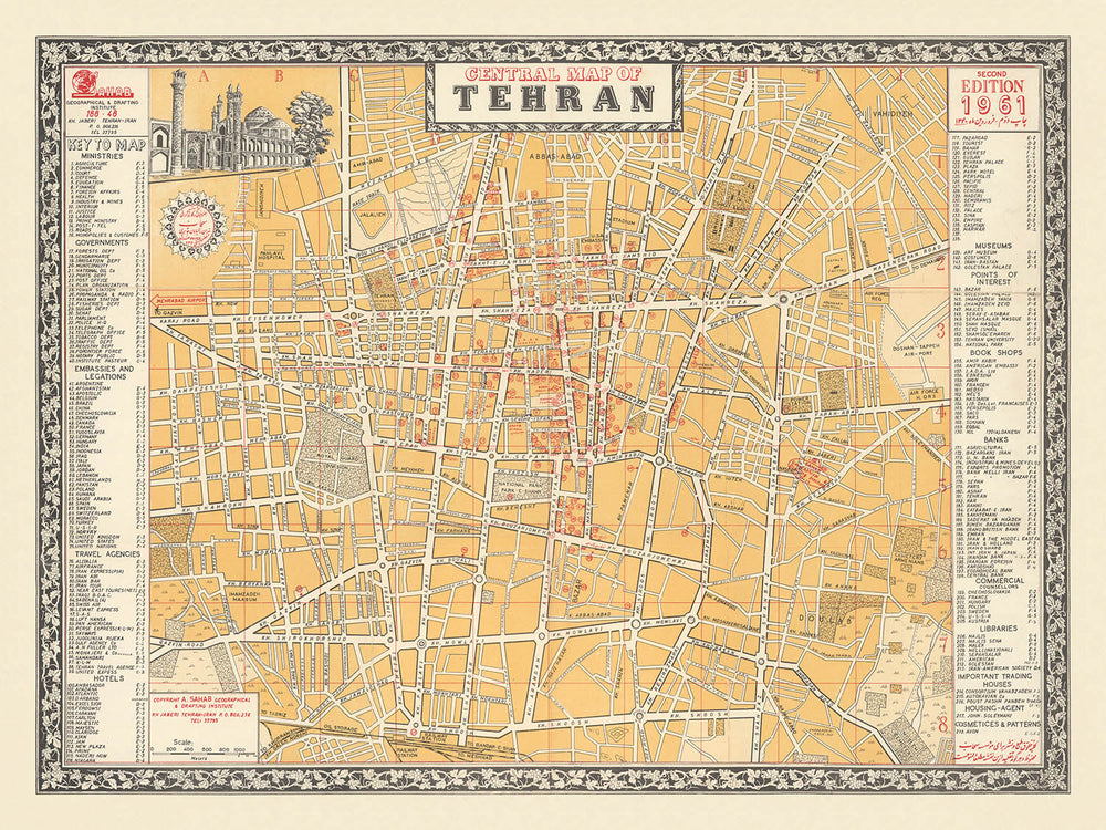 Ancienne carte de la rue de Téhéran par Sahab, 1961: Mosquées, Université de Téhéran, Ambassades, Parc-e-Shahr, Avenues principales