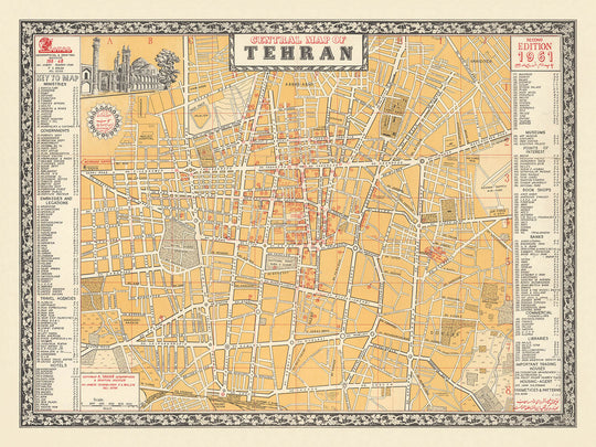 Abbas Sahab, souvent salué comme le « père de la cartographie iranienne », a infusé cette carte à la fois de précision technique et de flair artistique. Son Institut de Dessin Géographique Sahab, fondé en 1935, était à l'avant-garde de l'évolution cartographique de l'Iran, et cette carte est un témoignage de sa profonde connaissance des rues et de l'esprit de Téhéran. Les motifs de vigne élégants qui bordent la carte font allusion aux esthétiques persanes traditionnelles, tandis que le design moderne et épuré signale une nouvelle ère pour la ville et la nation.