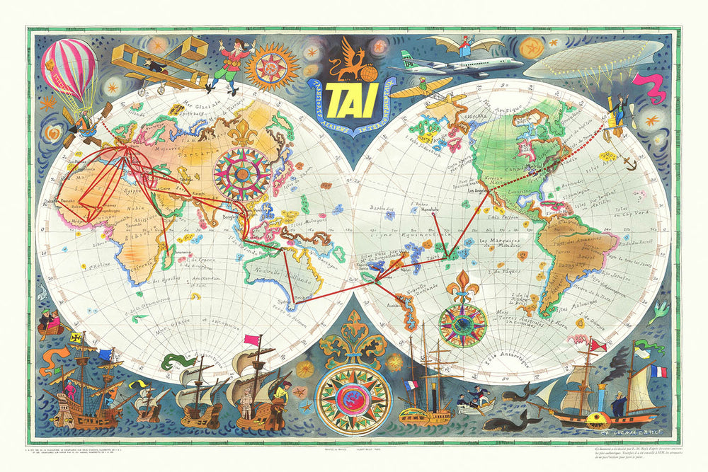 La carte illustre élégamment les routes mondiales de TAI, marquées de lignes rouges frappantes, tissant à travers les continents et au-delà des océans. Elle montre la portée de la compagnie aérienne de Paris vers des destinations exotiques telles que Madagascar, la Polynésie, et au-delà. Ce chef-d'œuvre thématique et pictural est orné d'illustrations fantaisistes d'explorateurs, d'animaux, et de navires historiques, offrant un aperçu du monde romantisé du voyage durant les années 1950. Chaque élément est méticuleusement conçu pour évoquer un sentiment d'émerveillement et de découverte.