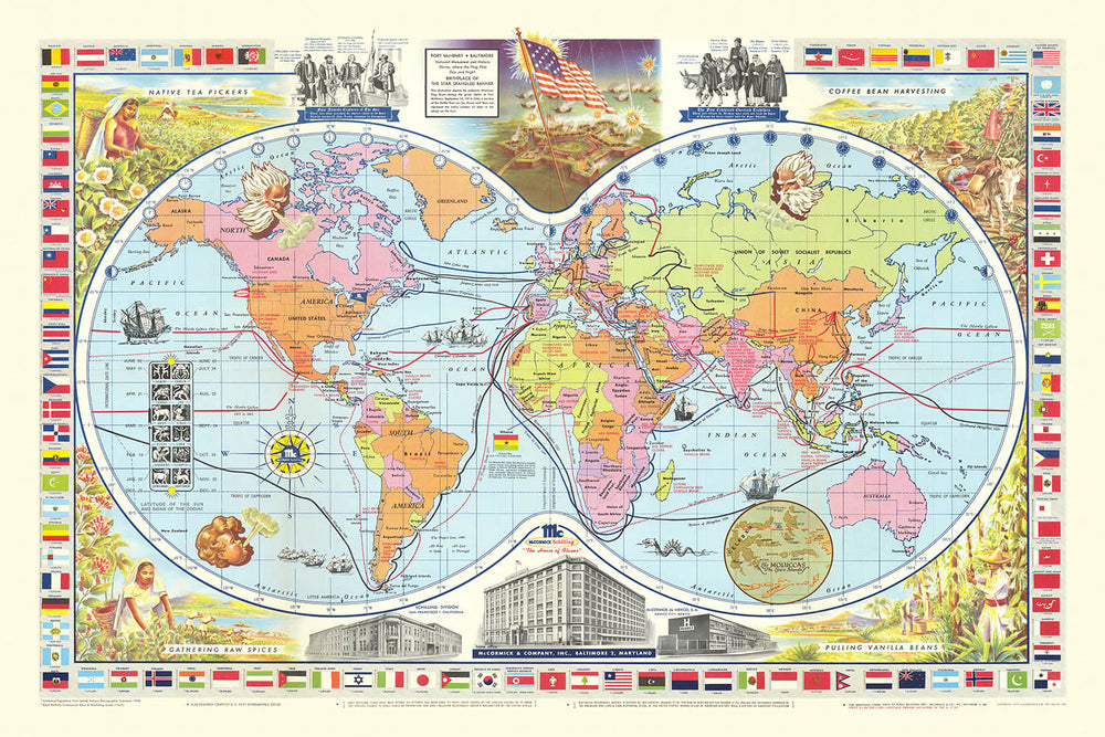 Ancienne carte du monde du café, du thé et des épices McCormick, 1957: commerce des épices, explorateurs, design du milieu du siècle