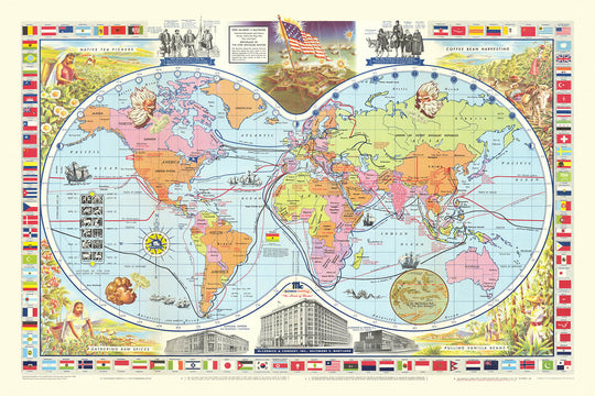Entrez dans le monde vibrant de la cartographie du milieu du siècle avec la captivante "Café, Thé, Vanille & Épices / Carte Picturale du Monde," créée par McCormick & Company en 1957. Cette carte remarquable est plus qu'une simple représentation de la géographie mondiale ; c'est une célébration du passé légendaire du commerce des épices et du rôle essentiel de McCormick dans la formation de l'industrie moderne des saveurs.