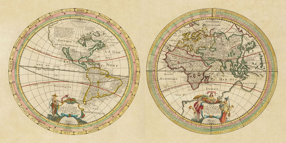 La conception de la carte témoigne du savoir-faire de Tavernier, avec ses deux hémisphères ornés de cercles concentriques qui affichent élégamment les points cardinaux et les 12 vents classiques de Timosthène de Rhodes. Ces vents, méticuleusement étiquetés en latin et en grec, offrent un aperçu des pratiques de navigation des anciens marins. Les bordures ornées de la carte et ses illustrations délicates renforcent encore son attrait visuel, ce qui en fait une œuvre d'art historique saisissante.