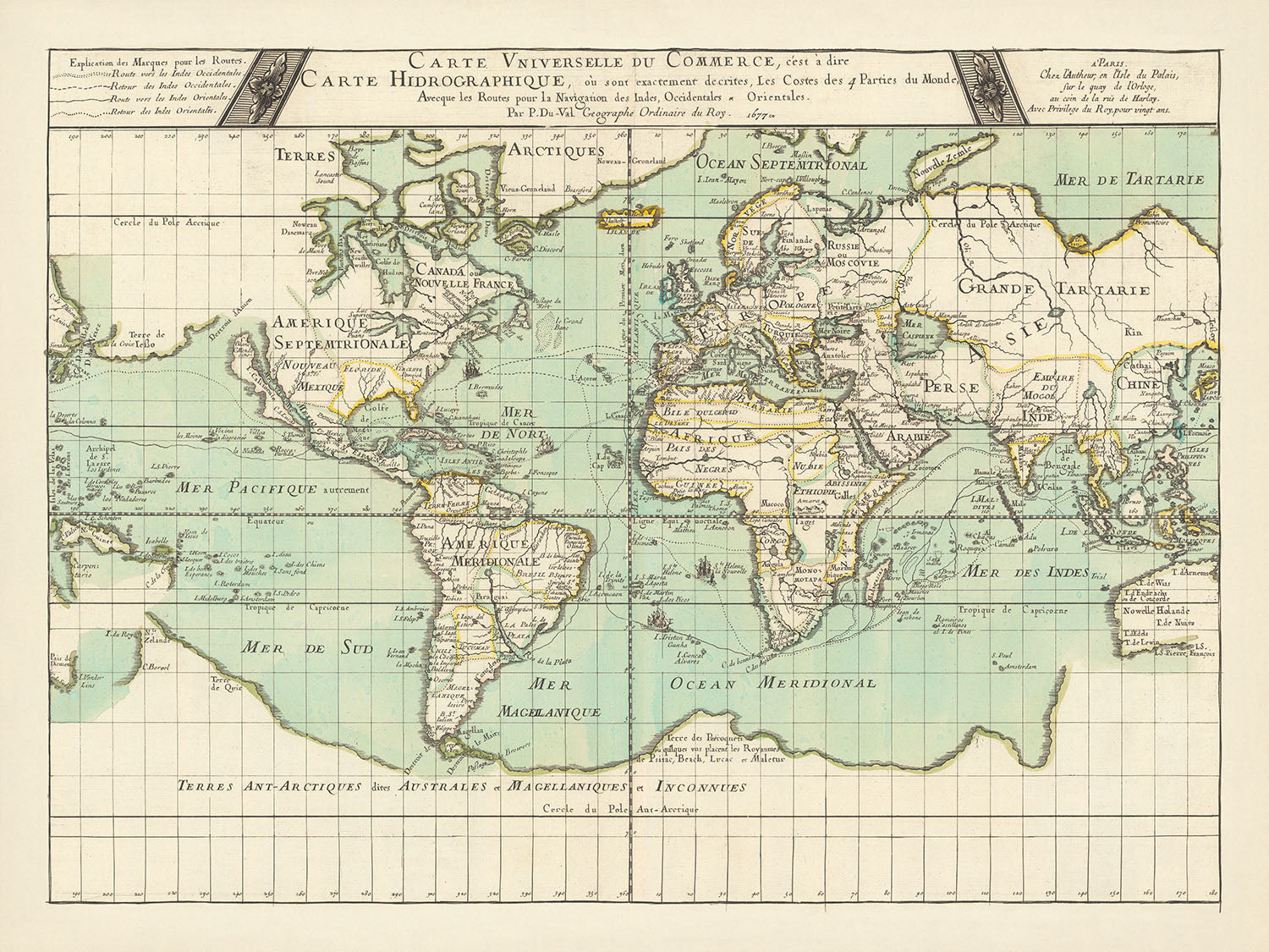 Le design et le style de cette carte sont aussi captivants que son contenu. L'inclusion par Du Val de quatre navires méticuleusement illustrés ajoute un élément dynamique et aventureux, symbolisant les exploits maritimes de l'époque. La projection cartographique de la carte et les détails complexes des routes commerciales soulignent son utilisation pratique pour la navigation. Les mers et les océans sont élégamment étiquetés, de la Mer Pacifique à la Mer de Tartarie, guidant le spectateur à travers les vastes voies maritimes du monde.