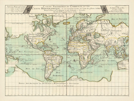 Historiquement, la "Carte universelle du commerce" est un artefact significatif qui encapsule les priorités commerciales et navigationales de son temps. Elle sert de document historique qui révèle les dynamiques commerciales, les paysages géopolitiques, et l'esprit aventurier d'une époque guidée par l'exploration et le commerce. Posséder cette carte revient à tenir un morceau d'histoire, un témoignage magnifiquement élaboré de l'âge des découvertes et de la quête durable pour cartographier l'inconnu.