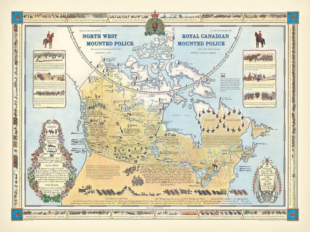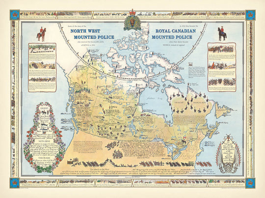 La carte est également une célébration des établissements, forts et postes de traite qui ont joué des rôles cruciaux dans l'histoire du Canada. Des grandes villes comme Toronto, Vancouver et Calgary aux postes historiques tels que Fort Macleod, Fort Garry et Fort Edmonton, la carte retrace l'arc de l'établissement et l'expansion de la civilisation à travers le continent. Des cartouches décoratives, des divisions maritimes et aéronautiques, et une multitude d'autres détails d'époque enrichissent l'expérience visuelle, faisant de cette carte non seulement un document historique précieux mais aussi une œuvre d'art qui donne vie à la saga épique de la Gendarmerie royale du Canada.