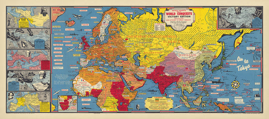La carte de Turner n'est pas simplement une représentation géographique ; c'est un récit de conquête et de libération. Elle met en lumière les territoires saisis par les puissances de l'Axe et ceux récupérés par les Nations Unies, fournissant une chronique visuelle des événements de guerre. Les annotations et les encadrés de texte de la carte offrent un riche contexte historique, détaillant des batailles significatives, des invasions et des bases navales stratégiques. Ce focus thématique transforme la carte en un outil éducatif, offrant des aperçus sur les stratégies et les résultats de la Seconde Guerre mondiale.